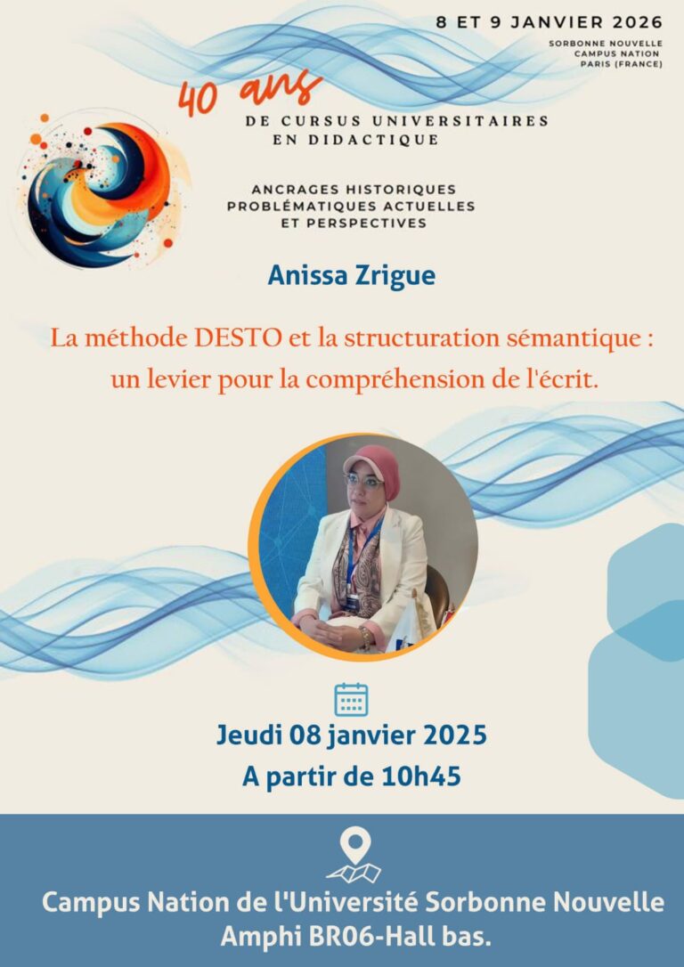 Anissa Zrigue, linguiste à l’Université de Kairouan (Tunisie) et partenaire du GREF, y présente sa méthode DESTO à travers la ...